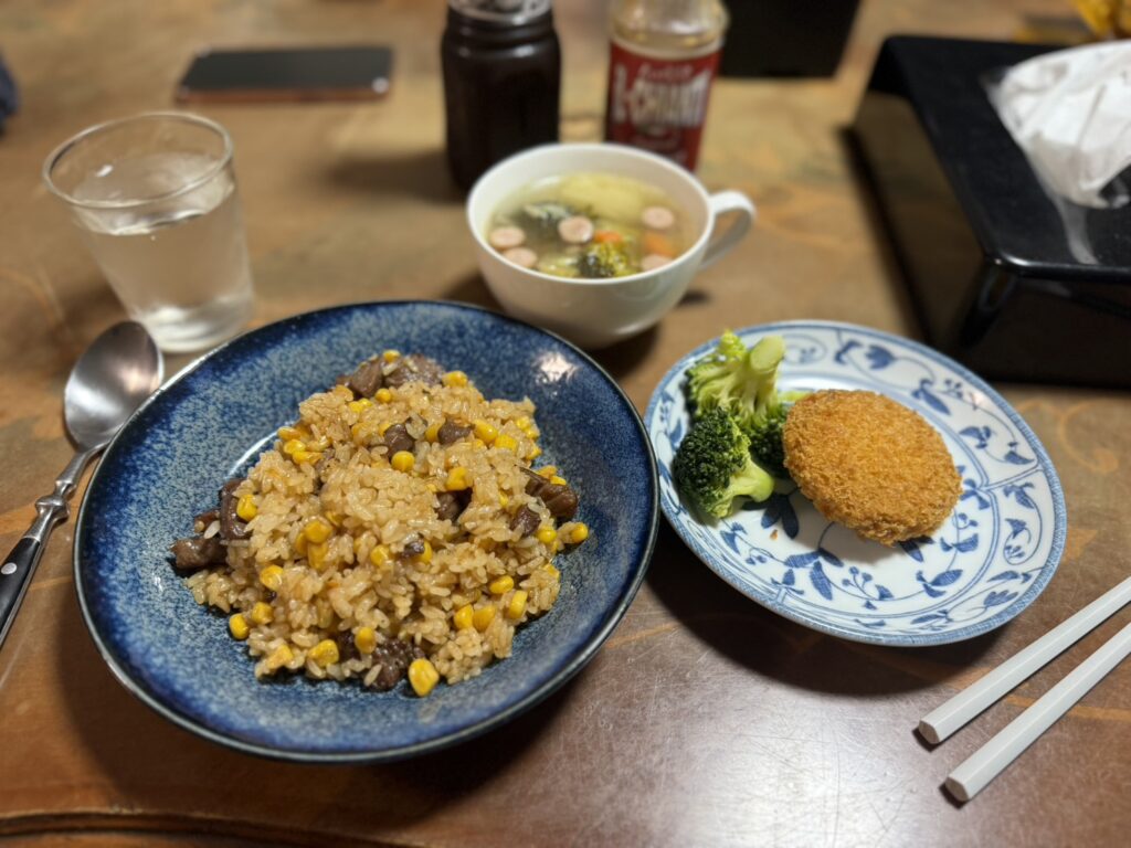 夜ご飯はポトフとメンチカツと妹が作ってくれたよくわかんないけどご飯!